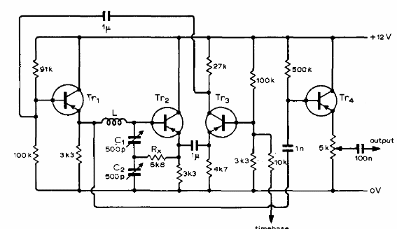 Este circuito genera señales para ajustes en FI de 10,7 MHz. Los transistores pueden ser los BC548 o equivalentes. Encontramos esta configuración en una documentación de los años 70. El circuito se puede alterar para operación en otras frecuencias.