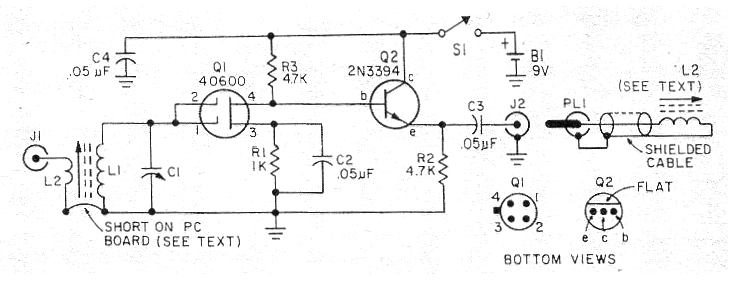 Este circuito fue indicado en el artículo de la revista americana Electronics Hobbyst del invierno de 1971. La revista ya no existe, pero el proyecto se puede montar con cualquier MOSFET de doble puerto equivalente para Q1 y paraQ2 se puede utilizar un BF494 o BF495. L1 consiste en 100 espiras de hilo 28 en un bastón de ferrita y L2 en 20 espiras en el mismo palo. J1 se conecta a una antena externa y L2 en la salida (que en realidad debería ser L3) co0nsiste en algunas vueltas de cable común alrededor de una radio de ondas medias. Con esta función es posible recibir estaciones de onda medias muy débiles y distantes. Durante la noche, con un receptor de buena calidad (selectividad sensibilidad) se puede incluso recibir estaciones internacionales. El capacitor variable puede ser retirado de una radio de ondas medias fuera de uso.