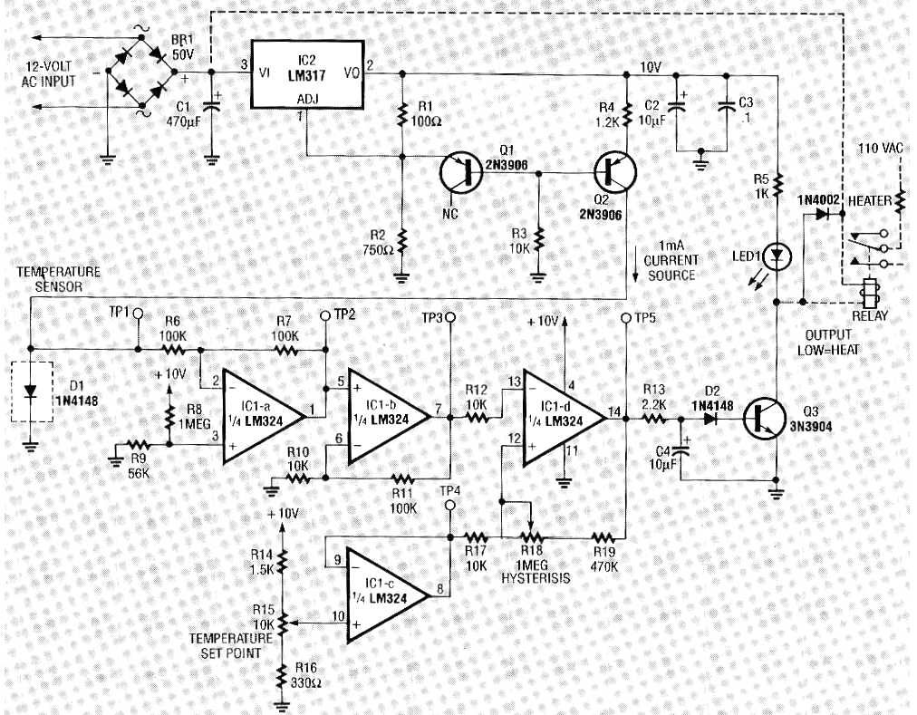 El sensor de este termostato electrónico, publicado en el artículo de Radio Electronics de junio de 1992, es un diodo 1N4148. En la publicación original él controla un elemento de calentamiento resistivo a través de un relé, pero existen alternativas que pueden ser adaptadas a la aplicación. Los transistores PNP pueden ser del tipo BC558 y el NPN del tipo BC548. La alimentación para el circuito viene de un transformador de 12 V x 500 mA o más de secundario y primario de acuerdo con la red local de alimentación. El sensor de temperatura puede quedar a cierta distancia del aparato. En la aplicación se aprovecha el cambio de característica del diodo con la temperatura cuando se polariza en el sentido directo. El relé es de 12 V x 650 mA.