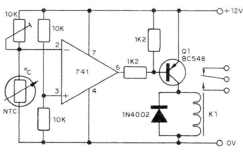 Para ser utilizado en invernaderos, sistemas de calefacción o secado, este dispositivo acciona un relé cuando la temperatura en el sensor cae por debajo de un valor predeterminado. El ajuste del punto de disparo se realiza en el trimpot, de acuerdo con la resistencia presentada por el sensor (un NTC) a la temperatura en que se desea el disparo. El circuito completo del aparato se muestra en la figura El relé es de uso general para 12 V. La alimentación en este circuito no necesita ser simétrica. El transistor es de uso general PNP, pudiendo ser utilizado el BC557 o sus equivalentes, como el BC558, BD136, BD138, etc. El sensor debe presentar una resistencia del orden de 500 a 1 000 ohms a la temperatura en que se desea el accionamiento del circuito, para mayor facilidad de ajuste y precisión de funcionamiento. El cambio de posición del NTC con el trimpot cambia el modo de acción del circuito, que pasará a operar como una alarma de sobretemperatura, es decir, disparando cuando la temperatura suba más allá de cierto valor.