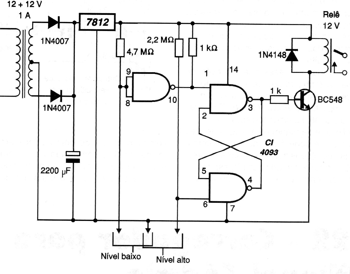 Este circuito es de una documentación de 2001 con el propósito de controlar una bomba que llena una caja de agua y apagar cuando está llena. Los sensores son hilos con las puntas descascadas colocadas en los niveles deseados (mínimo y máximo). El relé es de 12 V debiendo tener contactos de acuerdo con la corriente de la bomba.