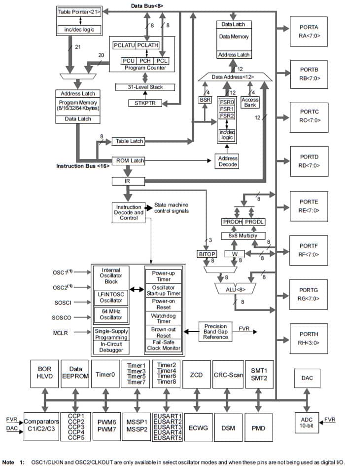 Junio de 2017 - Ya se pueden obtener en Mouser Electronics los nuevos microcontroladores de Microchip PIC18LF67K40 de 8 bits con memoria Flash / EE / RAM y una rica integración de periféricos. El oscilador interno es de 64 MHz y se programa com cerne PIC de 83 instrucciones. Se incluyen 47 canales ADC y un DAC de 5 bits. Los niveles de salida de 4,96 V y la CPU se reproduce en 16MIPS.