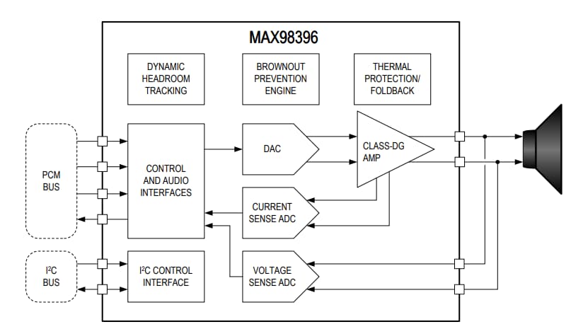 Disponible en Mouser, el amplificador de audio Maxim Integrated MAX98396 es un dispositivo de altavoz mono de clase DG de alta eficiencia con potencia de reposo líder en la industria. Este amplificador de audio está diseñado con detección de I/V, motor de prevención de caídas de tensión (BPE) y seguimiento dinámico de margen dinámico (DHT). El amplificador MAX98396 permite aplicaciones de ultrasonido que brindan soporte para frecuencias de muestreo de hasta 192 kHz y una banda de paso más alta (para fs> 50 kHz). Este amplificador también admite una ruta de derivación para las señales de ultrasonido a través del amplificador, por lo que no es atenuada por el procesamiento de audio. El dispositivo MAX98396 proporciona una interfaz de modulación de código de pulso (PCM) para datos de audio y una interfaz I2C estándar para la comunicación de datos de control.