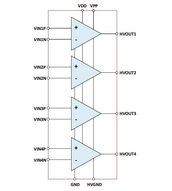 Microchip Technology HV56264 Quad High Voltage Amplifier Array IC cuenta con una fuente de alta tensión operacional de 225 V y una fuente de baja tensión de 5.0 V. El Amplifier Array IC tiene un rango de tensión de entrada de 0 V a 3.3 V y una variación de salida de 1.0 V a VPP - 10 V con capacidad de corriente de fuente / disipador de 3 mA. El Microchip HV56264 Array IC está diseñado para un rendimiento máximo con una corriente mínima de alto voltaje. La corriente de alta tensión para cada canal es inferior a 75 μA. El HV56264 está disponible en los paquetes TFBGA de 60 Ld.