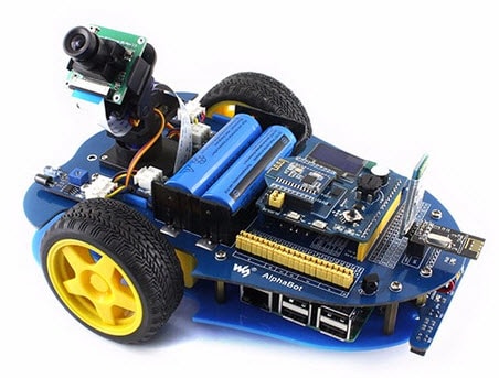 AlphaBot consiste en una plataforma para el desarrollo de robots compatible con Raspberry Pi y Arduino. El kit contiene una placa base, chasis móvil y una tarjeta de controlador para utilizar los códigos abiertos de ejemplo.