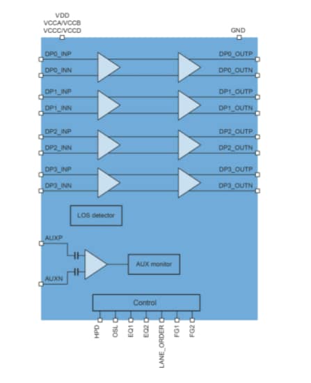El NXP Semiconductors PTN3816 20 Gbps DisplayPort Linear Redriver de 4 pistas ofrece una solución de alto rendimiento, 20 Gbps por pista, y está diseñado para aplicaciones DisplayPort upstream (lado de fuente DP) y downstream (lado DP Sink). El PTN3816 mejora la calidad de la señal de alta velocidad en las interfaces DisplayPort en múltiples plataformas y aplicaciones. El NXP PTN3816 20Gbps DisplayPort Linear Redriver de 4 carriles presenta ecualización de recepción programable por pin, control de linealidad de salida para mejorar la integridad de la señal y permitir la extensión del canal al reducir la interferencia de símbolo a símbolo (ISI). Además, el IC implementa el espionaje AUX para monitorear las señales AUX para configurar de manera óptima el enlace y obtener ahorros de energía y rendimiento SI.