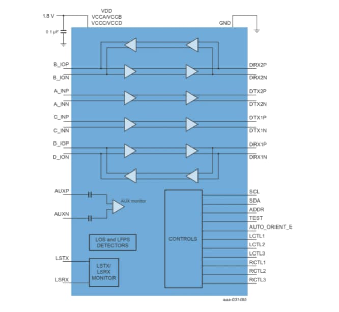 El NXP Semiconductors PTN38007 Multiprotocol USB4 20Gbps Linear Redriver está optimizado para los modos USB3.2, DisplayPort 1.4 y Thunderbolt3 Alt / aplicaciones USB4 en aplicaciones de puerta descendente (DFP) o de puerta ascendente (UFP). El PTN38007 tiene un monitor de seguimiento de señal de banda lateral para el modo DP (AUX) y el modo Thunderbolt3 / USB4 (LSTX / RX) para optimizar la configuración y reconocer los modos de ahorro de energía. El NXP PTN38007 USB4 Multi-Protocol 20 Gbps Linear Redriver ofrece ecualización lineal programable, control de linealidad de oscilación de salida con fijación de pines o control I2C para mejorar la integridad de la señal y permitir la extensión del canal al reducir la interferencia de símbolo a símbolo (ISI). El PTN38007 se utiliza normalmente entre el procesador y un temporizador frente a los puertos USB Type-C ™.