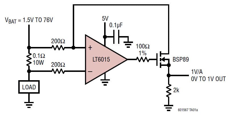 El circuito integrado LT6015 de Linear Technology (Analog Devices) consiste en un amplificador operacional de precisión Over-the-Top® con alimentación de 3 V a 50 V y entrada en modo común de -V a + V (+ 76V) y RRIO. El producto ganado x banda pasante es de 3,2 MHz. Una aplicación importante sugerida es en transmisores de 4 a 20 mA de uso industrial.