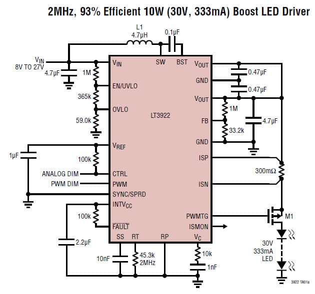 La Linear Technology (Analog Devices) está proporcionando a través de la Mouser Electronics el LT3922 un controlador de LEDs de 2 A tipo step up (ascensor) con dimmer PWM de 128: 1 y tensiones de entrada de 2,8 V a 36 V.