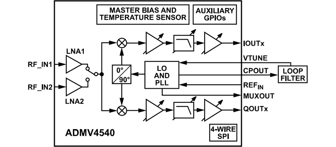 Analog Devices Inc. presenta el demodulador de cuadratura de banda K ADMV4540, que es un demodulador de cuadratura altamente integrado con un sintetizador integrado ideal para la comunicación satelital de banda K de próxima generación. El extremo frontal de RF del ADMV4540 consta de dos rutas de amplificador de bajo ruido (LNA), cada una con una figura de ruido de banda lateral dual de 5dB en cascada óptima con ganancia máxima, lo que minimiza los componentes externos. Las rutas duales permiten el soporte para la polarización de la antena. La selección de ruta de LNA se puede realizar a través de la interfaz de periféricos en serie (SPI).