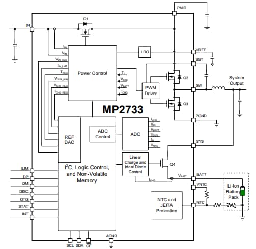 Los dispositivos de administración de cargador de batería MP2733 de Monolihic Power Systems (MPS) son dispositivos de administración de cargador de batería altamente integrados para baterías de iones de litio o de polímero de litio de una sola celda. Estos dispositivos funcionan con la gestión de la ruta de alimentación del sistema de CC de voltaje estrecho (NVDC). Los dispositivos MP2733 cuentan con una función de alimentación de baja impedancia que optimiza la eficiencia, reduce el tiempo de carga de la batería y prolonga la vida útil de la batería. Estos dispositivos admiten una amplia variedad de fuentes de entrada, incluidos puertos host USB estándar y adaptadores de pared de alta potencia con capacidades de carga rápida. La interfaz I2C permite que el dispositivo se controle de manera flexible con carga configurable y ajustes del sistema.
