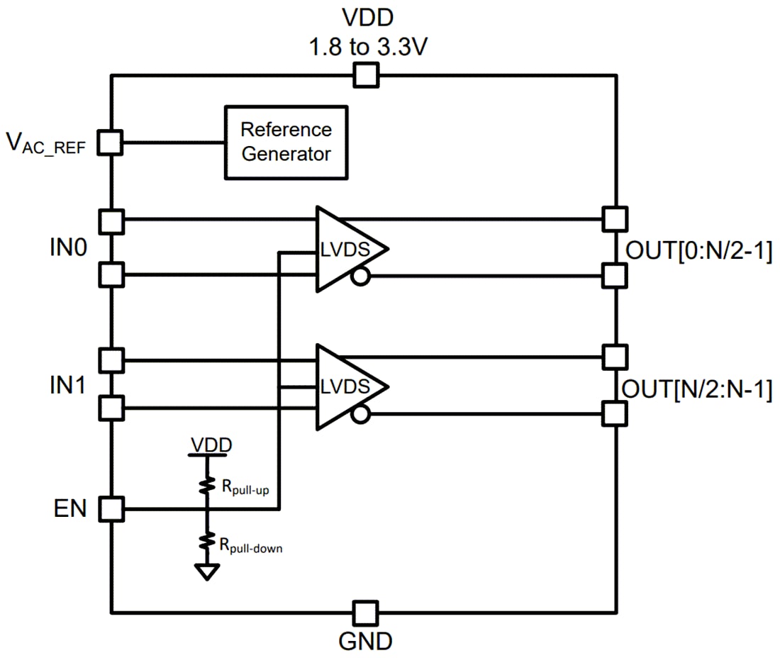 El búfer LVDS de bajo jitter aditivo LMK1D210x de Texas Instruments distribuye dos entradas de reloj (IN0 e IN1) para un total de hasta 8 pares de salidas de reloj LVDS diferenciales (OUT0, OUT7) con una distorsión mínima para la distribución del reloj. Cada bloque de búfer consta de una entrada y hasta 4 salidas LVDS. Las entradas pueden ser LVDS, LVPECL, HCSL, CML o LVCMOS. El LMK1D210x está diseñado específicamente para impulsar líneas de transmisión de 50 Ω. En caso de conducir las entradas en modo de un solo extremo, se debe aplicar el voltaje de polarización apropiado al pin de entrada negativo no utilizado.