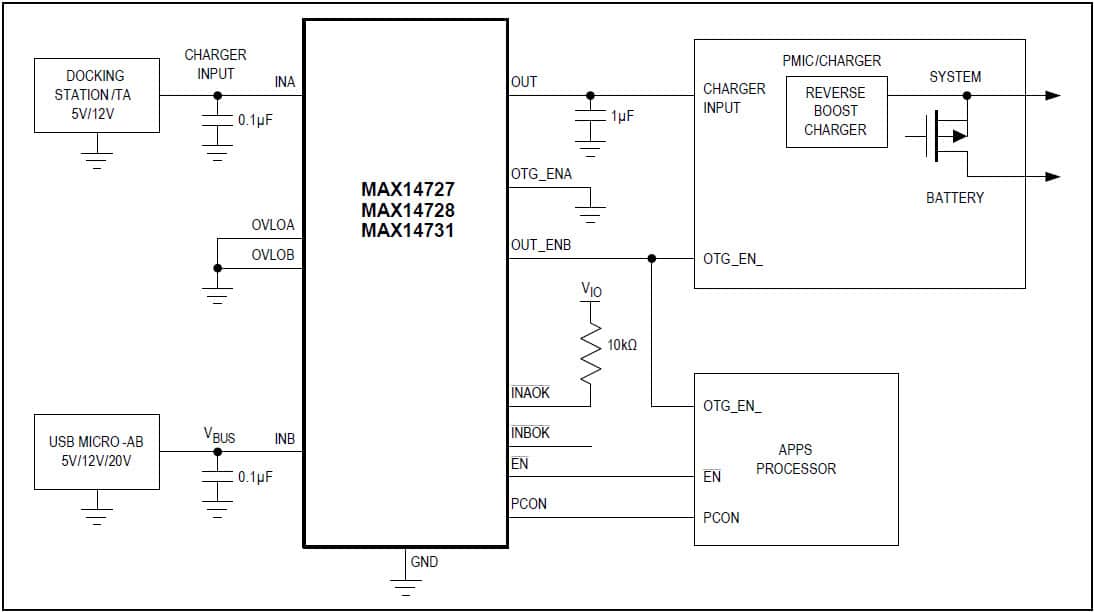 Los protectores MAX14727, 28 y 31 de Maxim, disponibles en Mouser Electronics, son dobles bidireccionales para tensiones de hasta 28 V dc. Los dispositivos también soportan brocas de hasta 100 V seleccionando automáticamente la fuente de entrada.