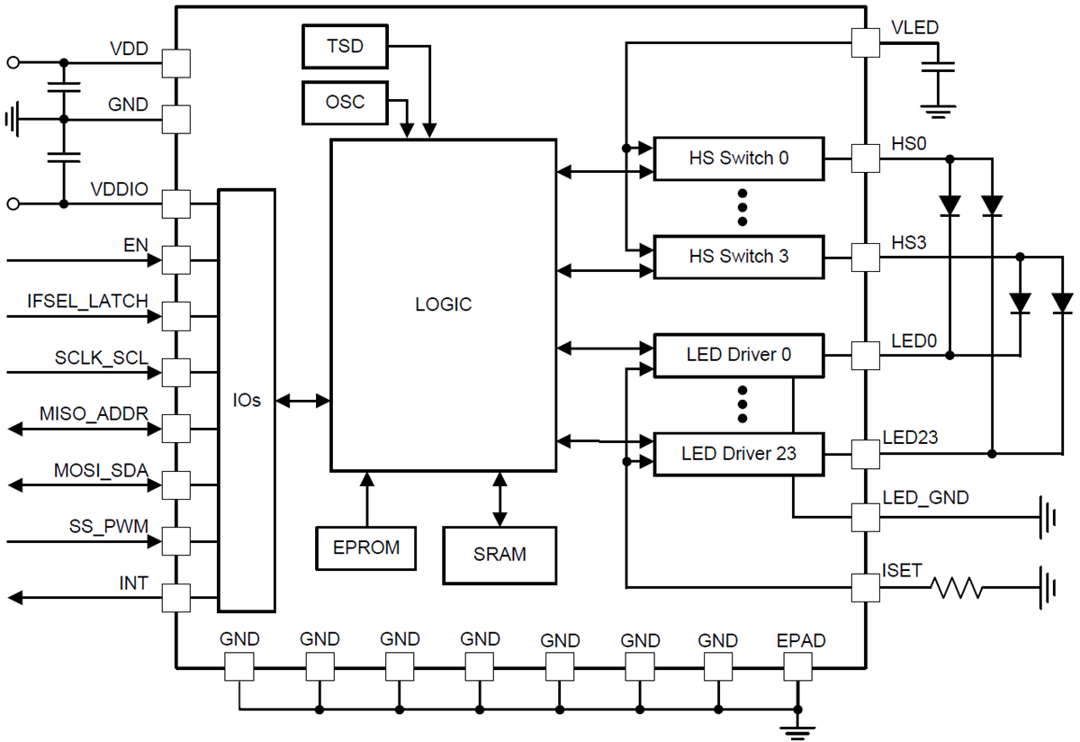 Texas Instruments ofrece a través de Mouser Electronics el LED 171596A, un controlador de matriz de LED de 96 canales. El dispositivo contiene 24 llaves de lado a lado con 15 mA de corriente y 4 llaves high side. El dispositivo tiene interfaz I2C de 8 bits y permite el control de brillo.
