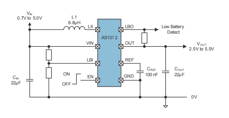 Los reguladores de tensión conmutados AS1312, disponibles en Mouser Electronics, pueden operar con tensiones de alimentación de 0,7 V a 5 V de entrada y salidas de 2,5 V a 5 V en pasos de 50 mV. La eficiencia es del 94% y la corriente de salida de 200 mA.