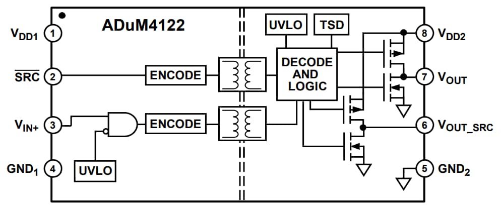Mouser Electronics cuenta con los Adu4122 de Analog Devices. Estos componentes consisten en gateadores aislados de alta velocidad con corriente de 3 A de pico y tensiones de 3,3 V a 6,5 V para Dcc1 y de 4,5 a 36 V para Vdd2.