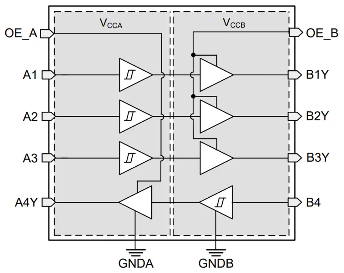 El traductor de nivel de tierra de 4 bits TXG104x de Texas Instruments es un traductor de nivel de tierra y voltaje no galvánico de dirección fija que admite cambio de nivel lógico entre 1,71 V y 5,5 V y cambio de nivel de tierra de hasta ±10 V. En comparación con los cambiadores de nivel tradicionales, la familia TXG104x puede resolver los desafíos de la traducción de voltaje entre diferentes niveles de tierra. VCCA hace referencia a GNDA y VCCB hace referencia a GNDB. Los pinos Ax están referenciados al nivel lógico VCCA, mientras que los pinos Bx están referenciados al nivel lógico VCCB. Tanto el puerto A como la puerta B pueden aceptar tensiones de 1,71 V a 5,5 V. Este dispositivo incluye dos pines de habilitación que pueden colocar las salidas respectivas en un estado de alta impedancia cuando el pi0o OE está conectado a GND o en un estado flotante. En caso de pérdida de energía o de señal de entrada, la salida se establece baja de manera predeterminada cuando el pin OE está alto. La fuga entre GNDA y GNDB es < 30 nA cuando VCC está en cortocircuito a GND.