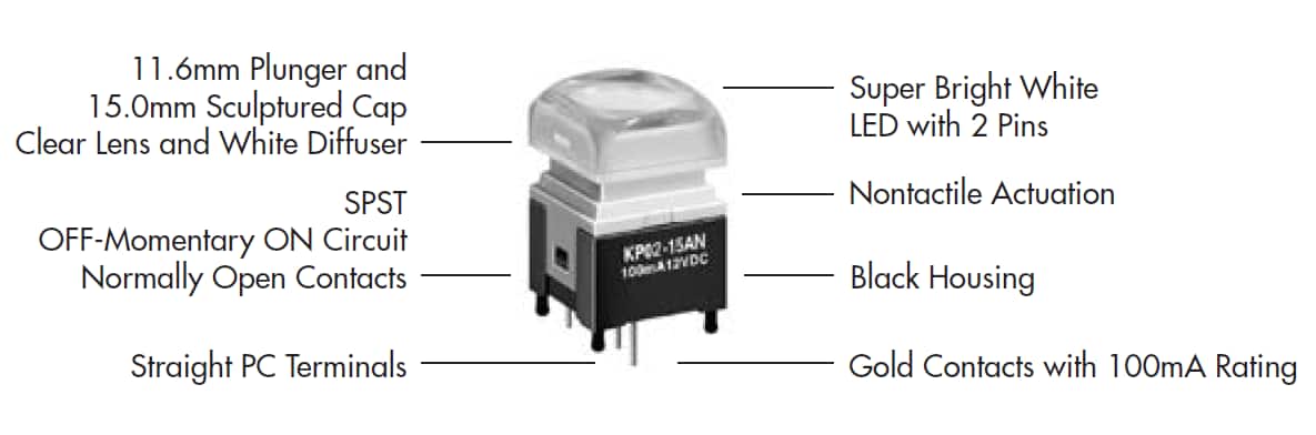 NKK Switches ofrece a través de Mouser Electronics interruptores de presión iluminados por LEDs en color único. Los interruptores poseen dos pinos de alimentación para los LED que se suministran en los colores blanco, amarillo o azul. La corriente máxima es de 100 mA con 12 V. Ver datasheet en el lin abajo y la foto del componente.