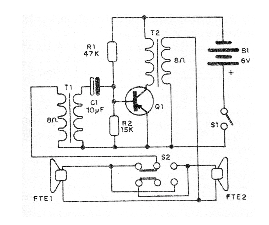 Es un montaje ultra simple que usted puede hacer con componentes de chatarra. Se trata de un intercomunicador experimental simple. Con la tecla S2 en una posición usted habla en un altavoz y el otro reproduce. Con S2 en la otra posición, invierte las funciones.