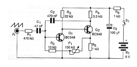 Los dos transistores se conectan para formar un paso amplificador de alta ganancia con acoplamiento directo. La realimentación de la señal sacada del colector de Q2, vía C2 se realiza para la base de Q1, manteniendo así las oscilaciones. Estas oscilaciones tienen sus frecuencias ajustadas por P1.