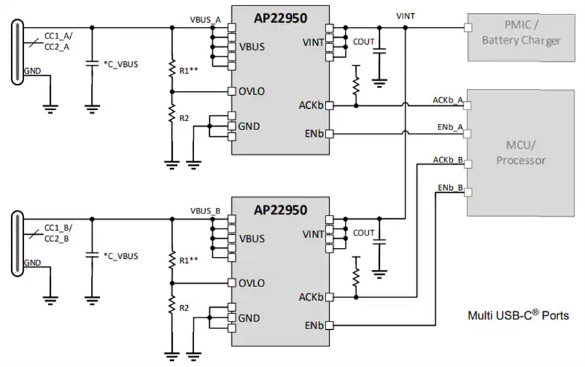El interruptor de alimentación USB PD VBUS AP22950 de Diodes Incorporated es un interruptor de alimentación USB PD unidireccional de alto voltaje con bloqueo por subtensión, bloqueo por sobretensión, protección contra corriente inversa y circuitos de protección contra sobretemperatura. El AP22950 de Diodes Inc. tiene una baja resistencia de 30 mΩ y funciona con una tensión de entrada VBUS de 2,5 V a 22,5 V. La protección contra corriente inversa ofrece un mayor aislamiento VINT que VBUS, lo que le permite alimentar el nodo de alimentación interno del sistema con la tensión más alta de varios dispositivos AP22950 conectados (apto para dispositivos portátiles con múltiples entradas de alimentación). El AP22950, ​​encapsulado en un encapsulado U-WLB2515-15, proporciona un umbral de protección contra sobretensión predeterminado de 23 V sin resistencia en el bloqueo por sobretensión (OVLO). Este umbral se puede ajustar de 4,0 V a 23 V mediante una resistencia externa en el pin OVLO. El pin ACKb puede utilizarse como indicador de estado de voltaje VBUS.