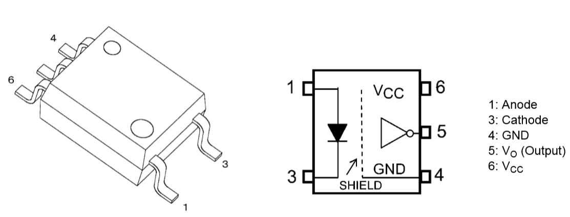 Este acoplador óptico con LED infrarrojo y receptor de circuito integrado de Toshiba está disponible en Mouser Electronics. El dispositivo funciona con tensiones de 2.7 V a 5.5 V y entrada digital de 24 V. El dispositivo tiene lógica de inversor con salida de colector abierto.