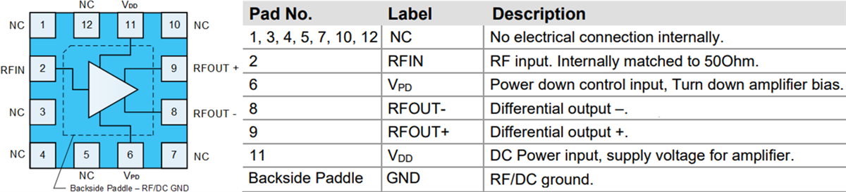 Disponible en Mouser Electronics, este sencillo módulo de entrada de 50 ohmios y salida diferencial de 100 ohmios tiene características compatibles con 5G. La ganancia con señales pequeñas es de 20 dB y la salida es de 35 dBm.