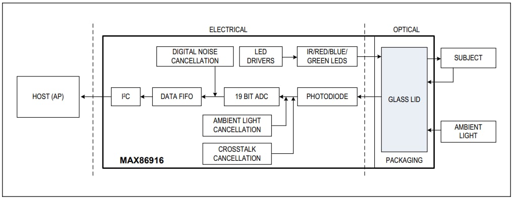 Maxim Integrated pone a disposición a través de Mouser Electronics el MAX86916, un módulo de sensor óptico integrado para aplicaciones biométricas, de proximidad y de detección de color. El dispositivo incluye un LED interno, fotodetectores con rechazo de la luz ambiental. La alimentación es de 1.8 V con 5 V separados para el LED.