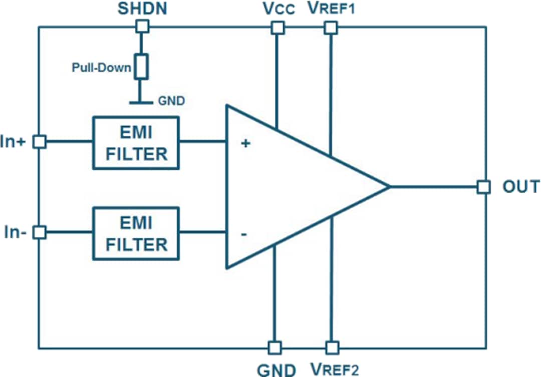Este amplificador operacional con detección de corriente ST Microelectronics, disponible de Mouser Electronics, puede operar con tensiones en modo común de -20 a +70 V y alimentarse con tensiones de 2.7 a 5.5 V. La ganancia es de 100V/V.
