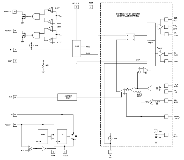 Una característica importante es la capacidad de excitar dos controladores en oposición de fase para reducir las pérdidas y también el ruido debido a la ESR del condensador de entrada.