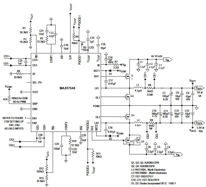 El MAX17548 consiste en un controlador de dos salidas tipo step-down que funciona con tensiones de entrada de 4,5 a 42 V y proporciona salidas de 0,8 a 24 V pudiendo ser utilizado en fuentes separadas de 10 A o una fuente simple de 20 A .