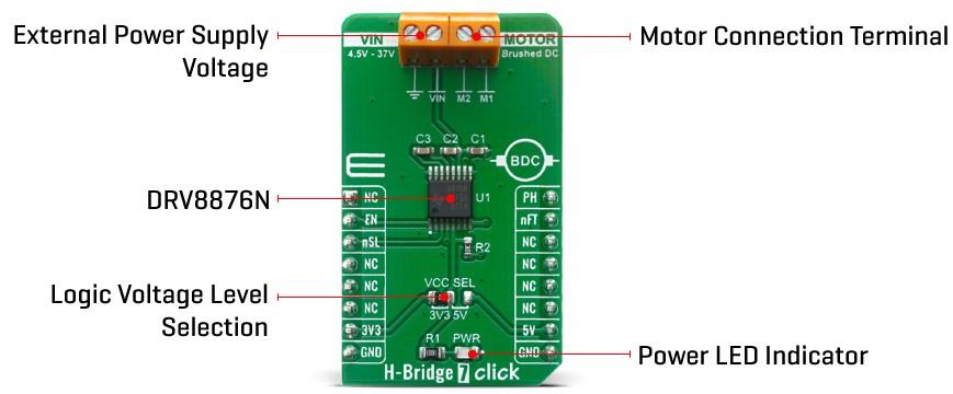 Disponible en Mouser, este puente H tiene un controlador de motor flexible para una amplia variedad de aplicaciones. La tensión de entrada puede ser de 3.3 V o 5 V y e para el motor de 4.5 a 37 V. La placa está indicada para controlar motores de CC con escobillas, servos y actuadores.