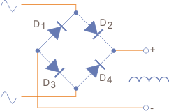 En el circuito de aplicación, los diodos puente conducen de dos a dos (en serie) cada semiciclo de la corriente alterna que se rectifica.