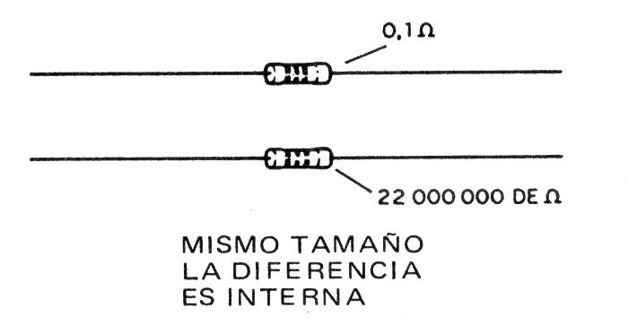 Los resistores usados en circuitos electrónicos pueden tener valores bajos como 0,1 Ohm o valores altos como 22.000.000 de Ohms. Así mismo, refiriéndonos a las resistencias anteriores (0,1 y 22.000.000 de Ohms) no encontraremos ninguna diferencia en su tamaño, como vemos en la fig. 2.