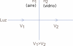 Cuando un rayo de luz incide perpendicularmente en una superficie que separa dos medios de diferentes naturalezas (aire y vidrio, por ejemplo), simplemente hay un cambio en su velocidad de propagación.