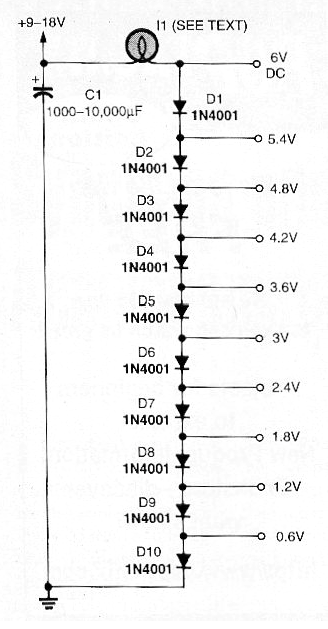 La revista Poptronics ya no existe, pero encontramos en su edición de mayo de 2000 esta fuente escalonada en que la reducción de la tensión es hecha por diodos y la limitación de corriente por una lámpara. Para 9 a 12 V de entrada utilice una lámpara de 12 V a 1 A.