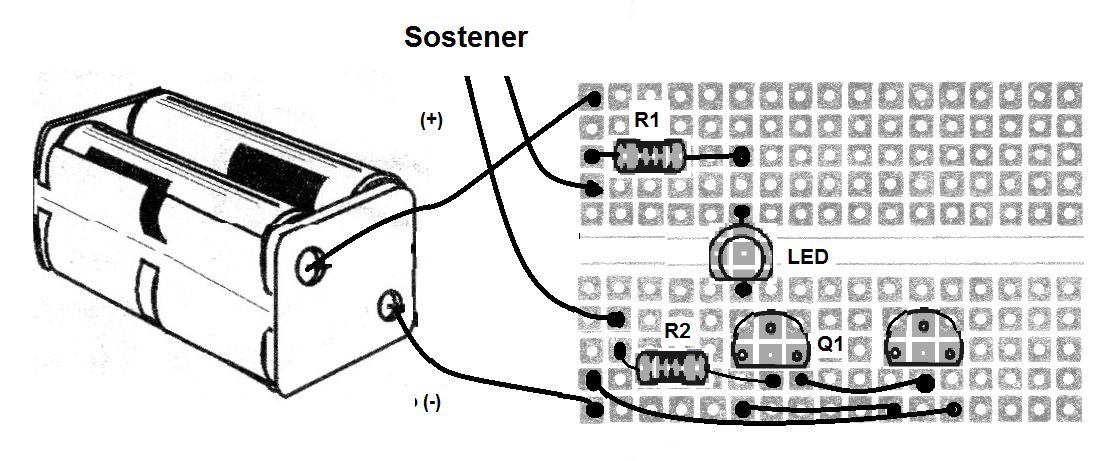 Montaje didáctico en matriz de 170 puntos cuya finalidad es aprender cómo funciona una configuración Darlington de dos transistores y utilizarla en un sensor muy sensible de tacto